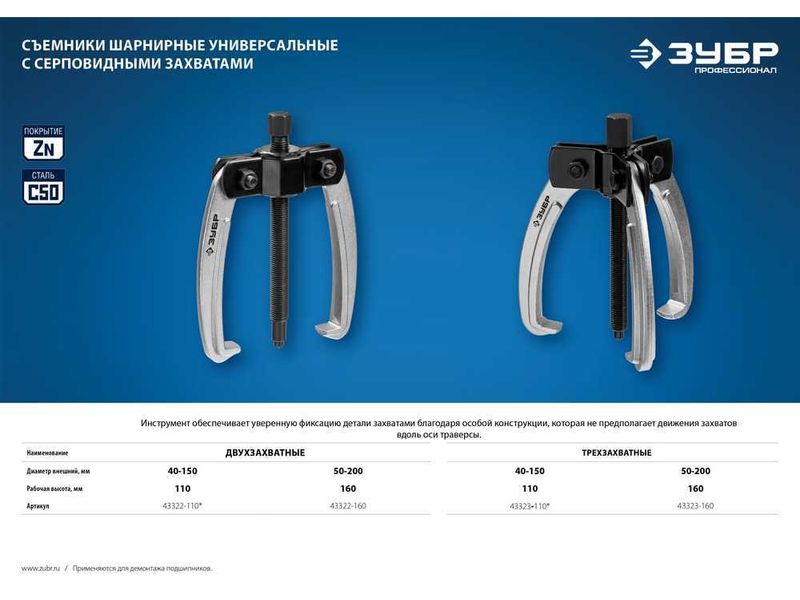 Съемник шарнирный 3-захватный с серповидными захватами, 110 мм, ЗУБР Профессионал 43323-110