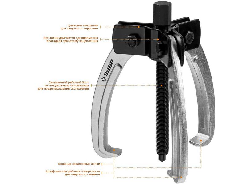 Захваты съемника выкованы из качественной инструментальной стали, что обеспечивает долгий срок службы при работе с высокими нагрузками.