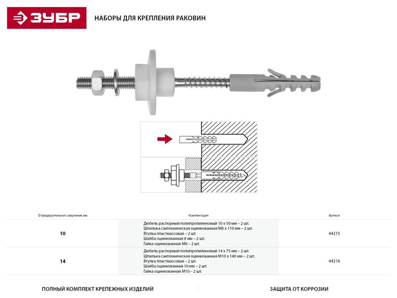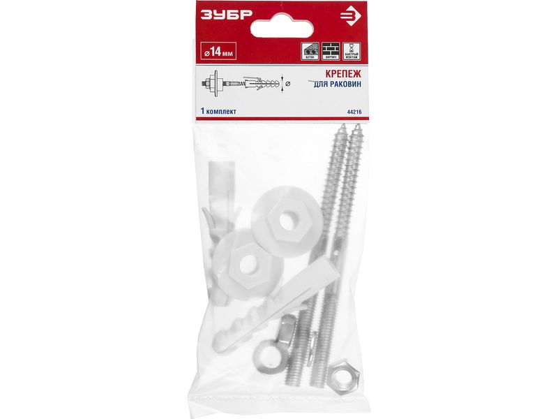 Набор ЗУБР для крепления раковин, 14 ммСантехнический крепеж ЗУБР предлагает широкий выбор готовых решений для крепления различных видов сантехники и сантехнических коммуникаций. Применяется для крепления раковин к бетонному или кирпичному основанию. Технические характеристики и функции - Диаметр предварительного сверления: 14 мм