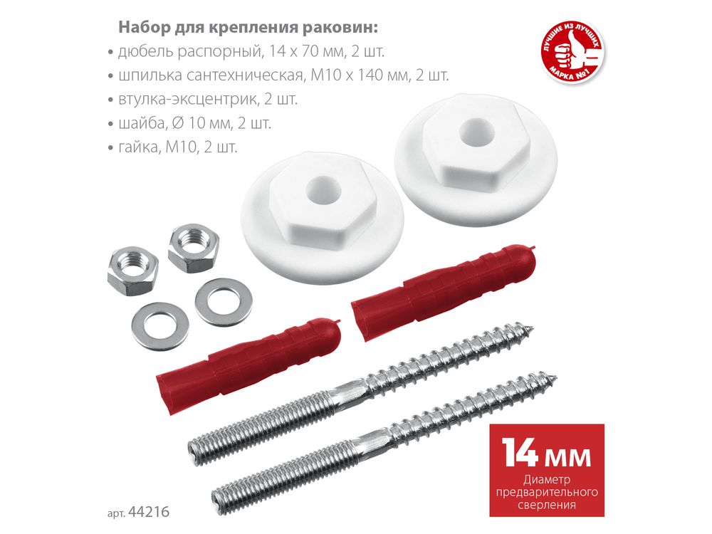 Набор включает в себя полный комплект крепежных изделий, необходимых для установки раковины: дюбели, шурупы, шайбы, гайки и втулки пластмассовые