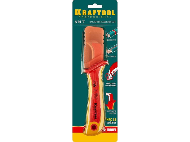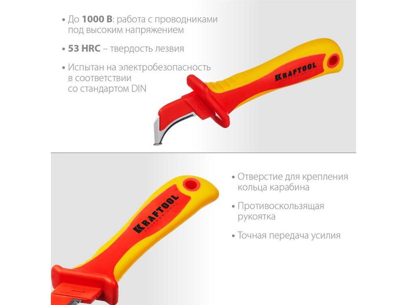 Нож монтерский диэлектрический KRAFTOOL изготовлен из высококачественной стали с закалкой рабочих поверхностей, предназначен для профессионального применения. Обладает повышенным ресурсом, обеспечивает наивысшее качество электромонтажных работ.