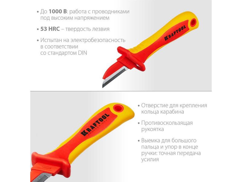 Нож монтерский диэлектрический KRAFTOOL изготовлен из высококачественной стали с закалкой рабочих поверхностей, предназначен для профессионального применения. Обладает повышенным ресурсом, обеспечивает наивысшее качество электромонтажных работ.