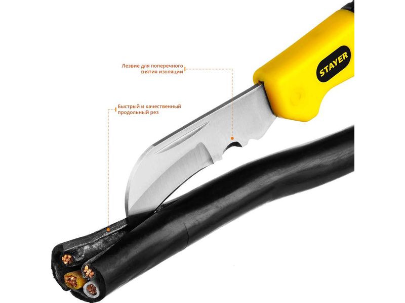 Нож монтерский STAYER изготовлен из высококачественной стали со специальной заточкой рабочих поверхностей, предназначен для профессионального применения. Обладает повышенным ресурсом, обеспечивает высокое качество электромонтажных работ.