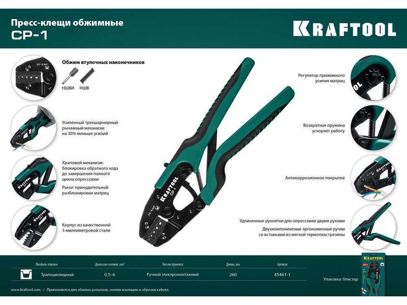 Пресс-клещи KRAFTOOL изготовлены из высококачественной стали с закалкой рабочих поверхностей, предназначен для профессионального применения. Обладает повышенным ресурсом, обеспечивает наивысшее качество электромонтажных работ.