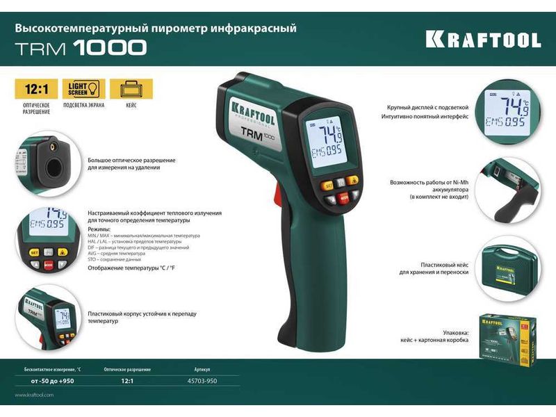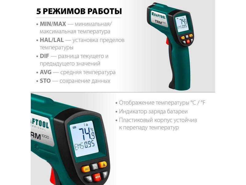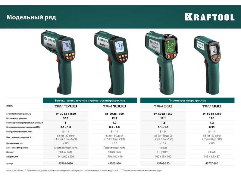 Инфракрасные пирометры KRAFTOOL обеспечивают бесконтактное измерение температуры с высокой точностью. Большое оптическое разрешение позволяет производить измерения на удалении. Корпус пистолетной формы с удобным курком и наведением точечного целеуказателя на объект.