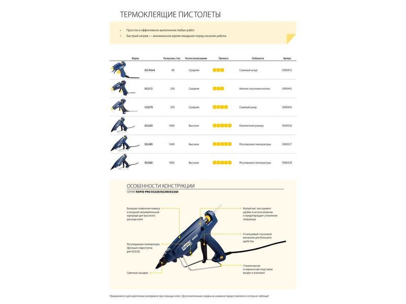 термоклеящий пистолет d12 мм, 300 Вт, регулировка температуры 120-230 °С расход 1800 г/ч , время нагрева 1 мин RAPID PRO EG360