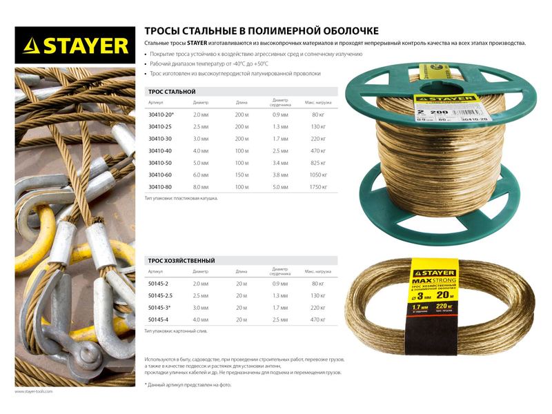 Хозяйственный трос Stayer предназначен для хозяйственно-бытового применения, при работе под статической нагрузкой. Высокое качество материалов и непрерывный контроль качества на всех этапах производства гарантируют высокое качество.