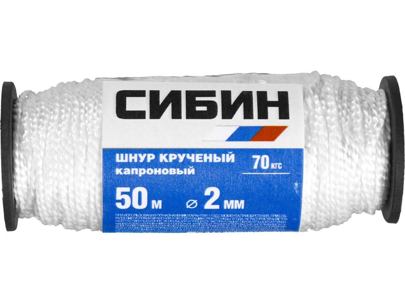 Шнур кручёный капроновый СИБИН, диаметр - 2 мм, длина - 50 м (катушка), 70 кгс