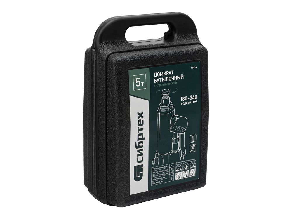 Домкрат гидравлический бутылочный Сибртех 50814, поставляющийся в пластиковом кейсе, предназначен для подъема грузов массой до 5 т на высоту от 180 до 340 мм. Не требует больших усилий от пользователя и значительно облегчает рабочий процесс. Домкрат будет полезен при проведении техобслуживания машины в автосервисе или гараже.