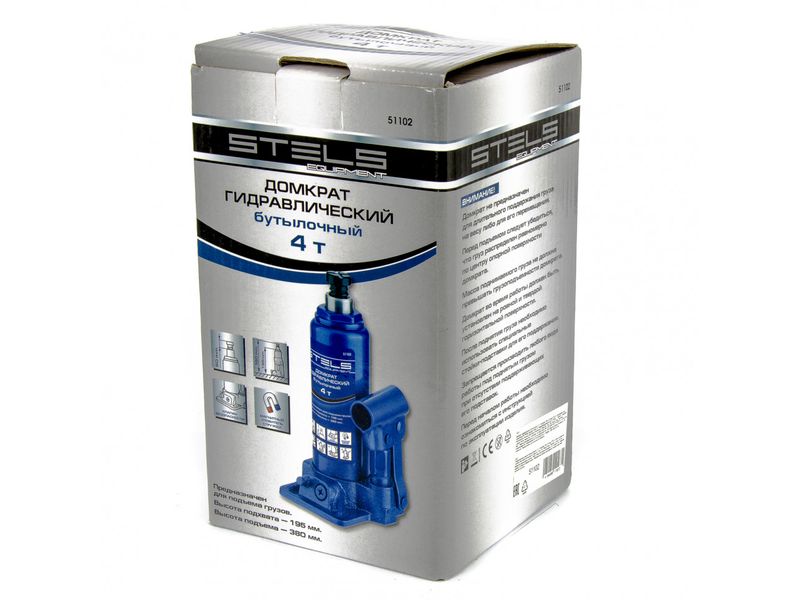 Гидравлический бутылочный домкрат Stels 51102 предназначен для поднятия грузов массой до 4 т на высоту со 194 до 372 мм. Позволяет установить жесткую опору под груз для последующего проведения ремонта. Будет полезен на станции техобслуживания, подойдет также для самостоятельного обслуживания автомобиля. Пригодится во время проведения ремонтно-строительных работ.
