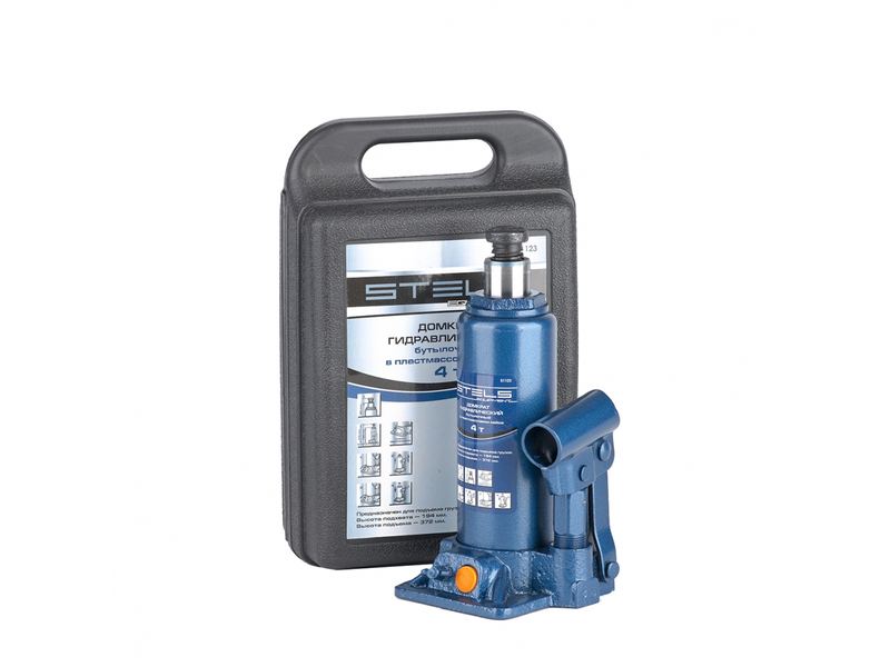 Гидравлический бутылочный домкрат Stels 51123, поставляющийся в пластиковом кейсе, предназначен для поднятия грузов массой до 4 т на высоту со 194 до 372 мм. Позволяет установить жесткую опору под груз для последующего проведения ремонта. Будет полезен на станции техобслуживания, подойдет также для самостоятельного обслуживания автомобиля. Пригодится во время проведения ремонтно-строительных работ.