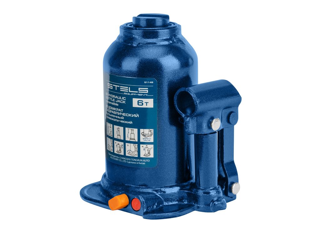 Домкрат гидравлический бутылочный Stels 51149, телескопический, используется для поднятия грузов весом до 6 т с на высоту 180-410 мм. Не требует больших усилий и оптимален для автомобилей с большим клиренсом. Домкрат можно использовать в гараже для самостоятельного ремонта машины или в автосервисе для решения профессиональных задач.