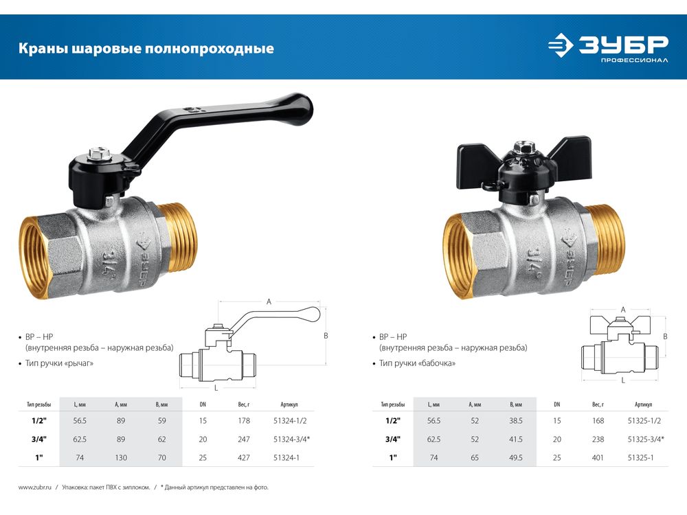 Системы водоснабжения и отопления arrow Кран шаровой arrow Кран шаровой ЗУБР полнопроходной "мама-папа", ручка, никелированная латунь, 3/4"-548