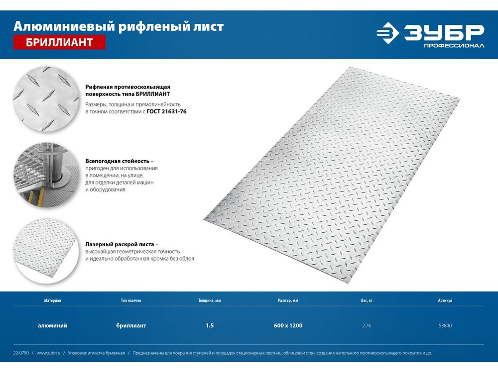 Алюминиевый рифленый лист ЗУБР Бриллиант 600х1200 х1.5 мм