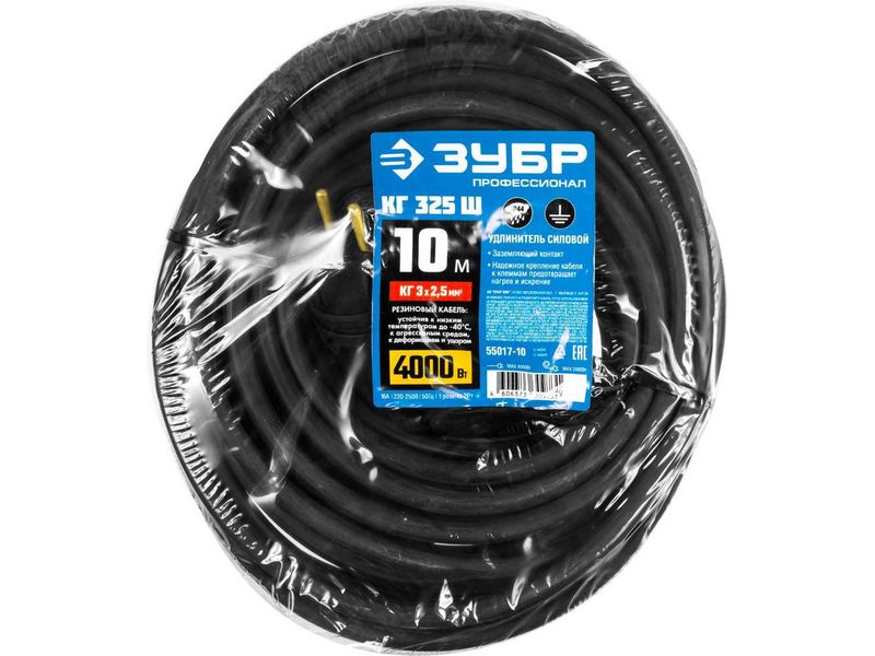 Купить Удлинитель-шнур КГ 325-Ш, 10 м, 4000 Вт, 1 гнездо, IP44, КГ 3х2,5 мм2, ЗУБР