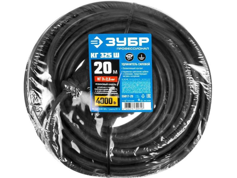 Удлинитель-шнур КГ 325-Ш, 20 м, 4000 Вт, 1 гнездо, IP44, КГ 3х2,5 мм2, ЗУБР