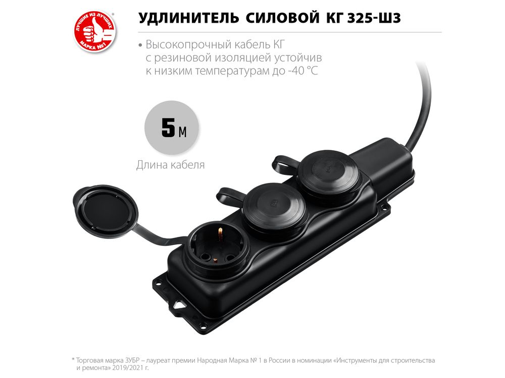 Силовой удлинитель ЗУБР КГ 3х2.5 5м 3гн. 4000Вт IP44, КГ 325-Ш3, Профессионал