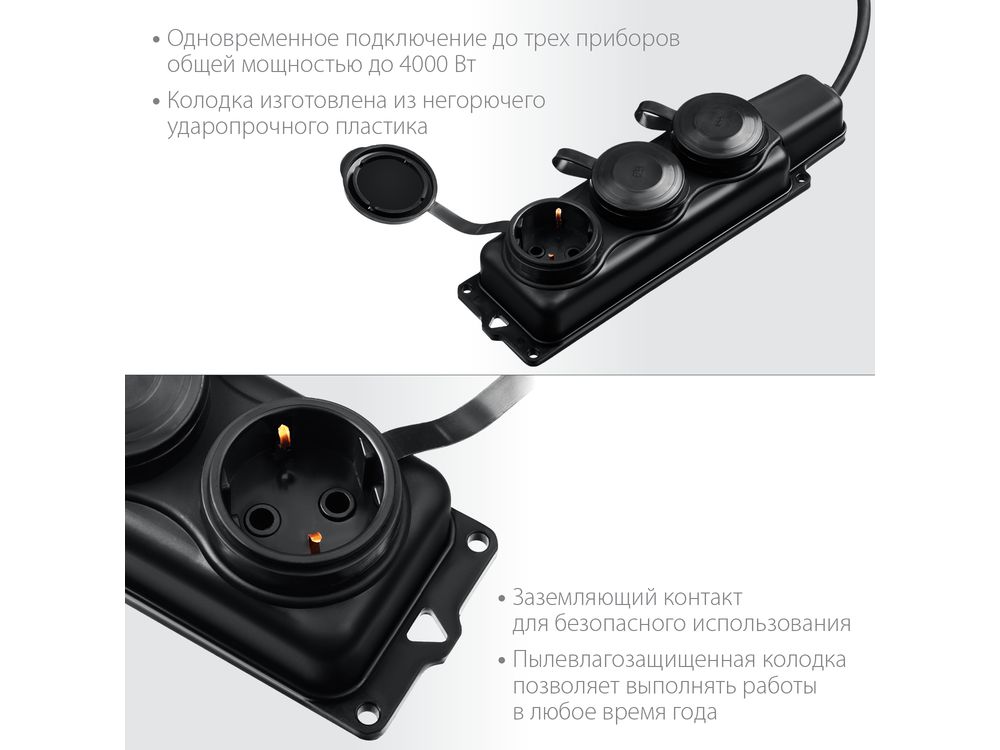 Удлинитель предназначен для подключения электрических приборов, которые находится на удалении от основного источника сети. Провод КГ (резиновая изоляция) устойчив к низким температурам до -40°С, к агрессивным средам, к деформациям и ударам. Позволяет выполнять работы в любое время года.