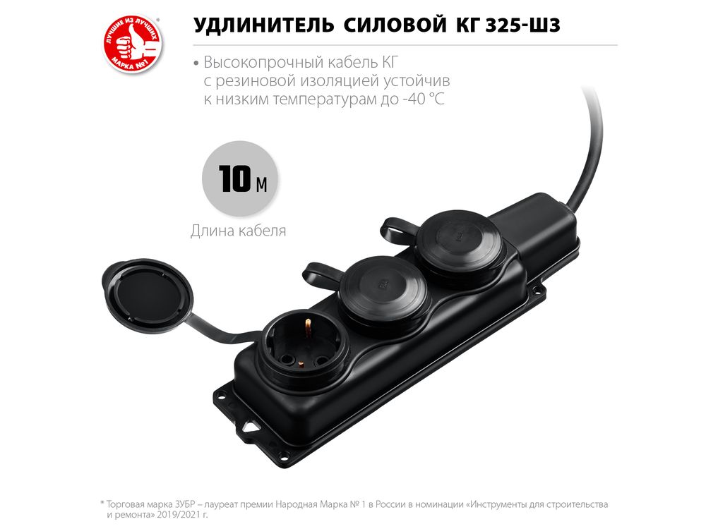 Силовой удлинитель ЗУБР КГ 3х2.5 10м 3гн. 4000Вт IP44, КГ 325-Ш3, Профессионал-684