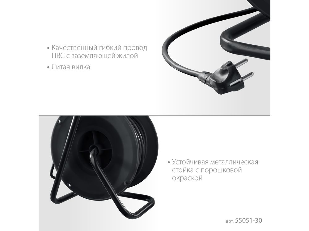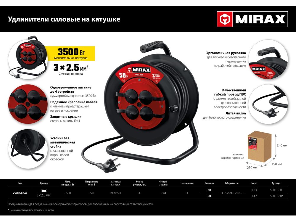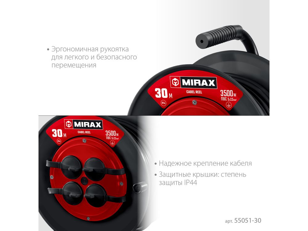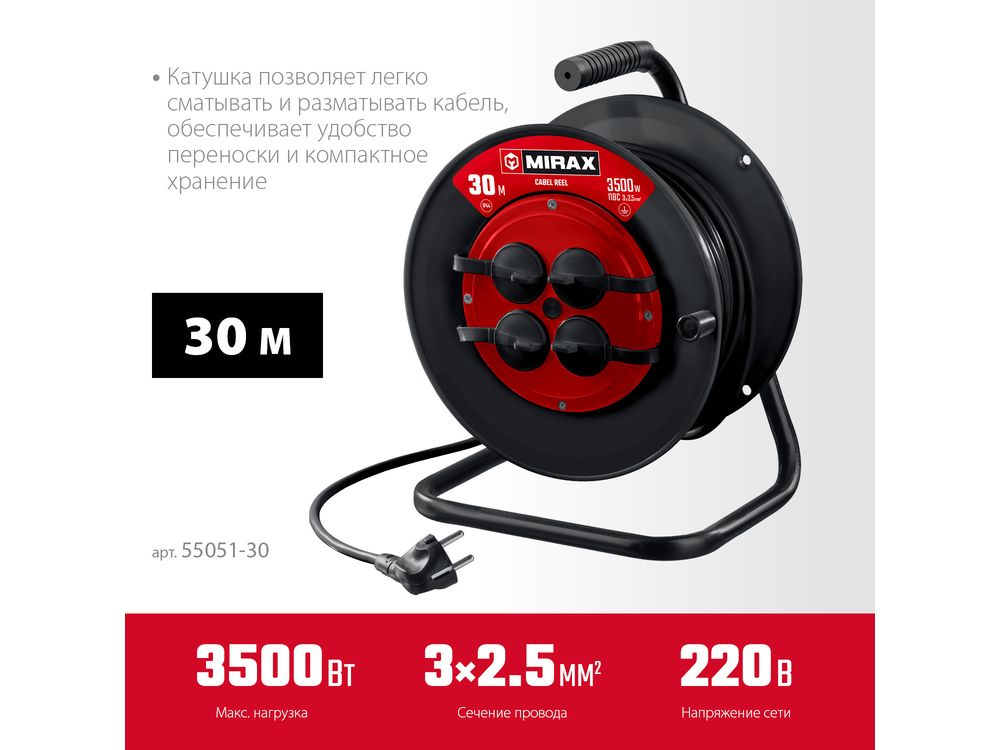 Силовой удлинитель на катушке MIRAX ПВС 3х2.5 30м 3500Вт IP44-684