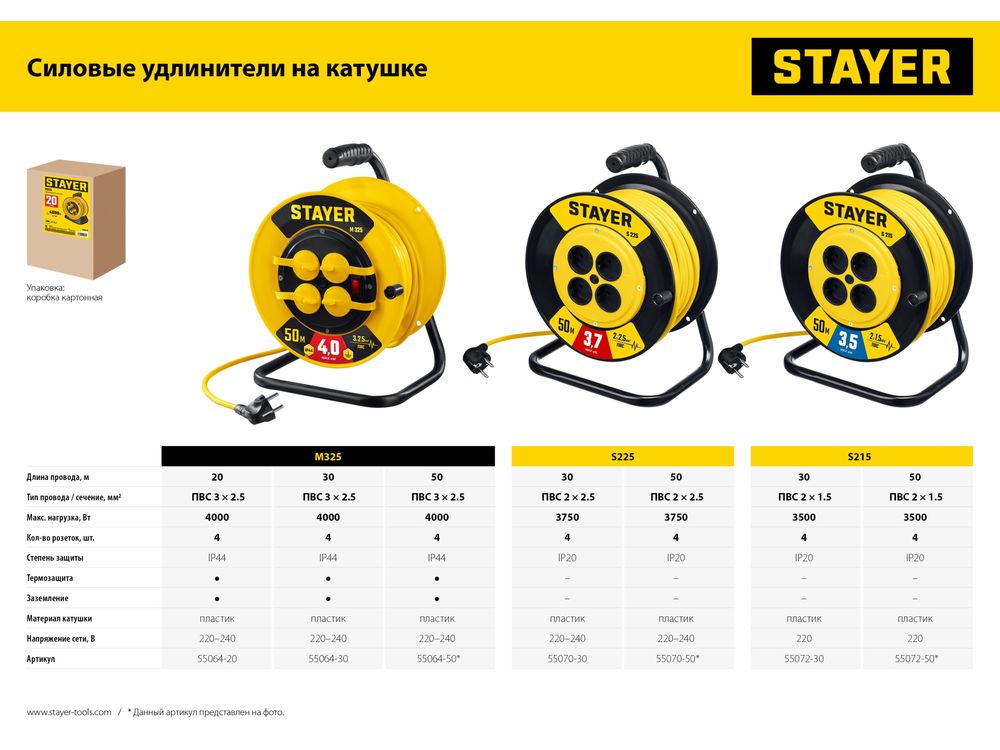 Силовой удлинитель на катушке STAYER ПВС 3х2.5 20м 4000Вт IP44, M 325-684