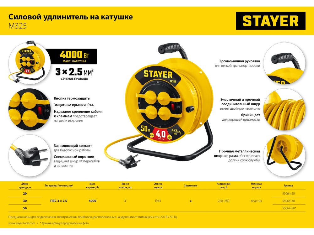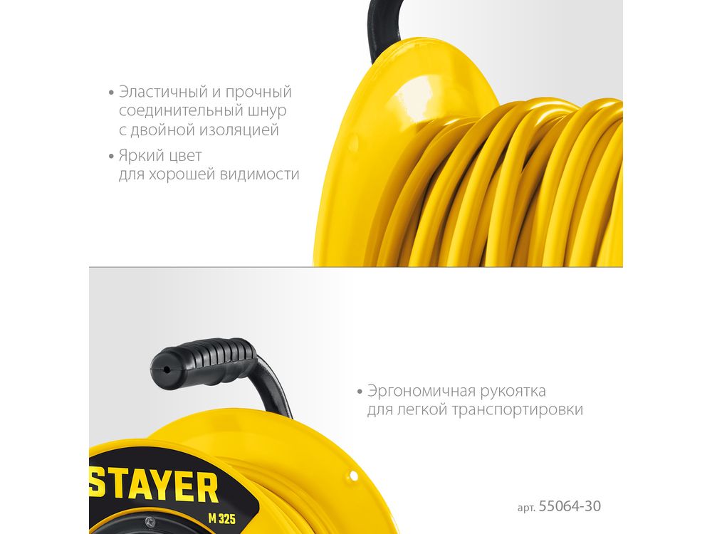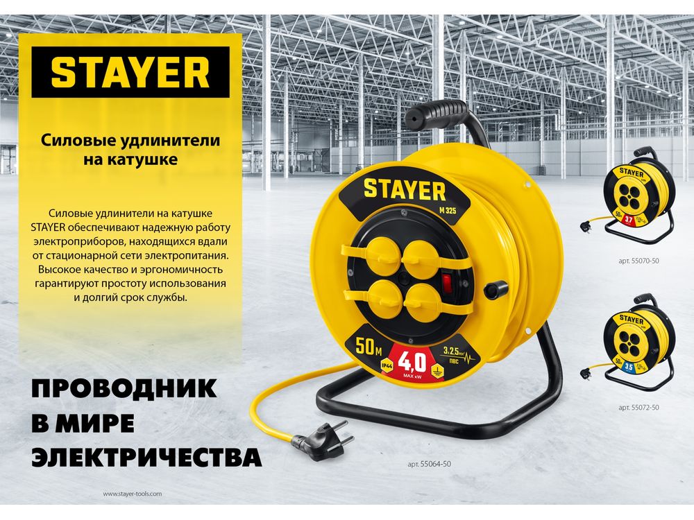 Силовой удлинитель на катушке STAYER ПВС 3х2.5 30м 4000Вт IP44, M 325-684