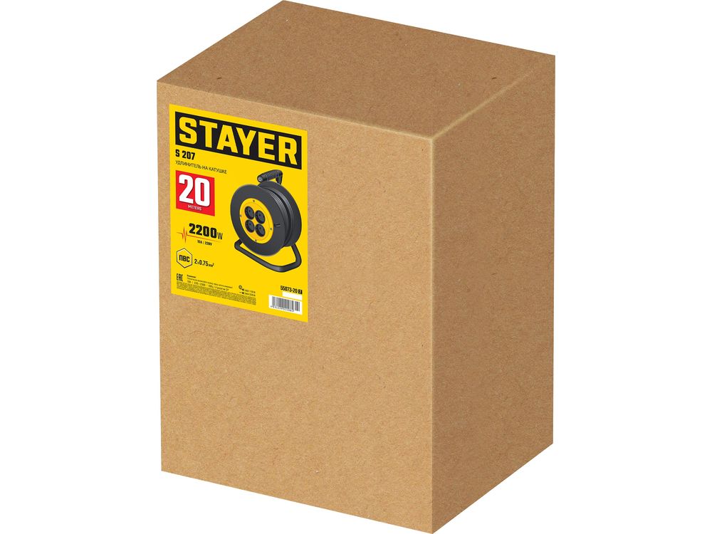 STAYER S-207, ПВС, 2 х 0.75 мм2, 20 м, 2200 Вт, удлинитель на катушке (55073-20)