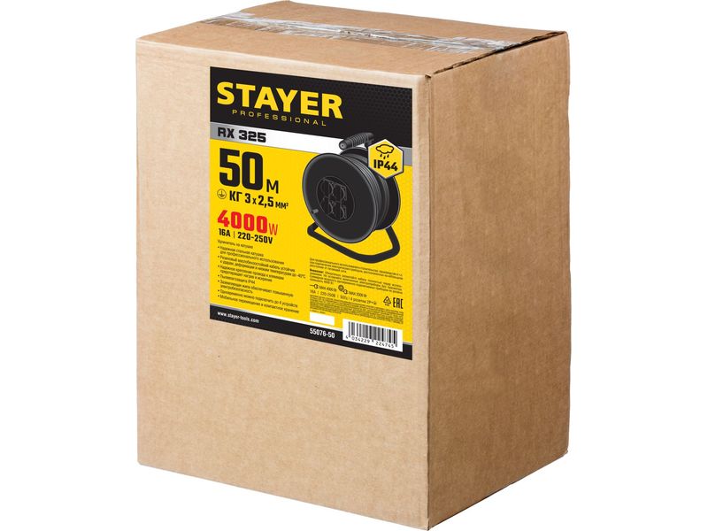 Купить Удлинитель на катушке RX 325, 50 м, 4000 Вт, 4 гнезда, IP44, КГ 3x2,5 кв мм, STAYER