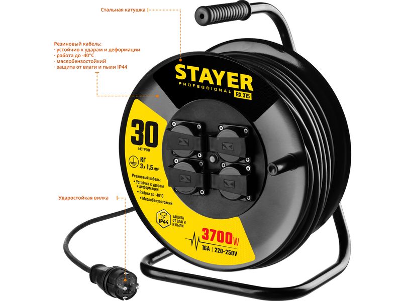 Удлинитель на катушке RX 315, 30 м, 3700 Вт, 4 гнезда, IP44, КГ 3х1,5 кв мм, STAYER