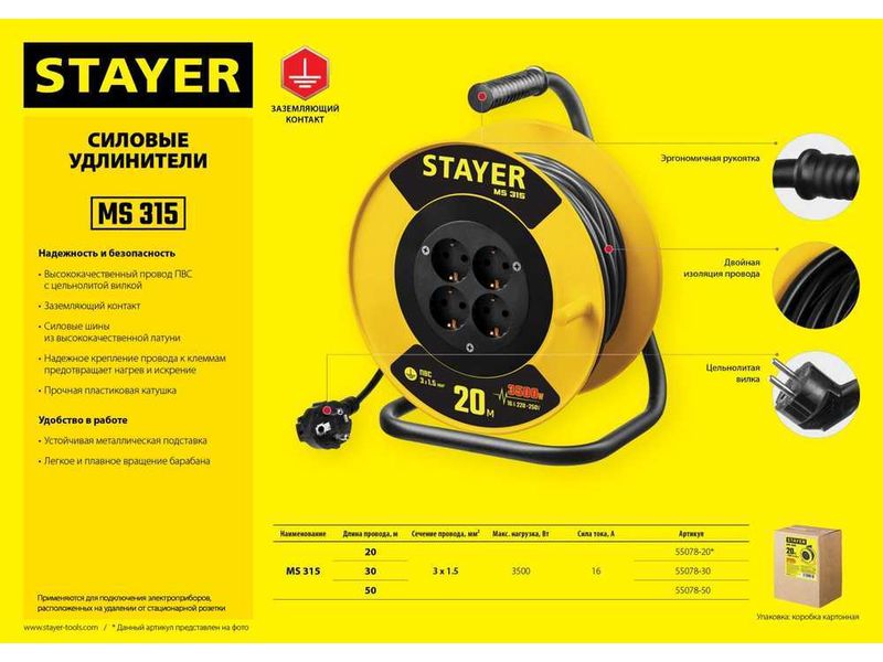 Купить Удлинитель на катушке MS 315, 30 м, 3500 Вт, заземление, 4 гнезда, ПВС 3x1,5 кв мм, STAYER