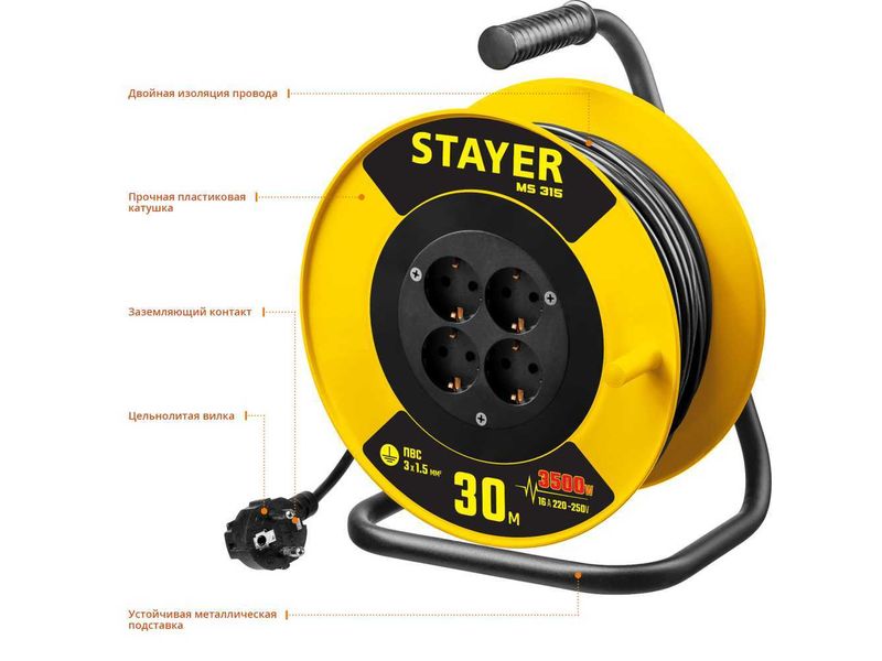 Удлинитель на катушке MS 315, 30 м, 3500 Вт, заземление, 4 гнезда, ПВС 3x1,5 кв мм, STAYER