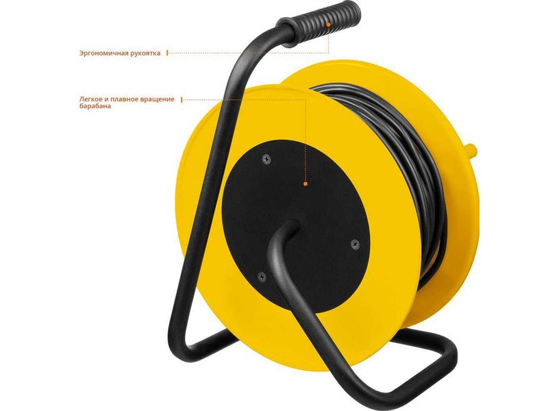 Катушка позволяет легко сматывать и разматывать кабель, обеспечивая мобильное перемещение и компактное хранение.