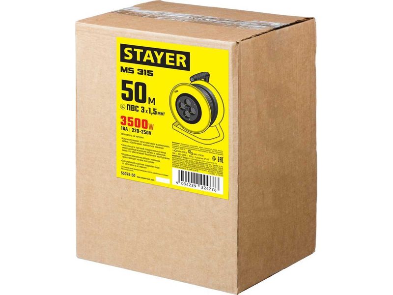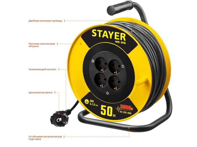 Удлинитель на катушке MS 315, 50 м, 3500 Вт, заземление, 4 гнезда, ПВС 3x1,5 кв мм, STAYER