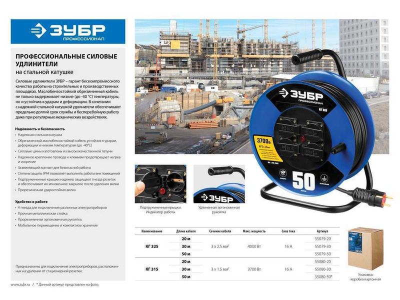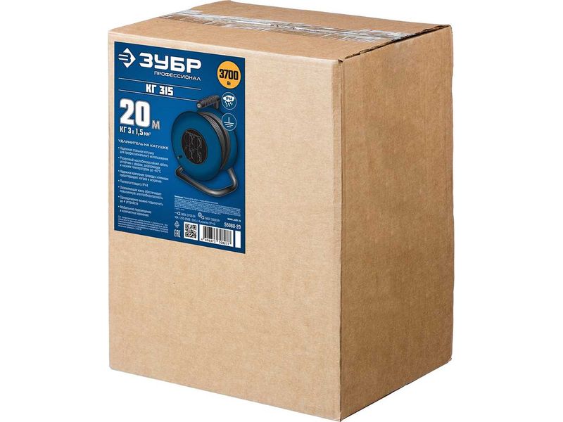 Купить Удлинитель на катушке "КГ 315", 20 м, 3700 Вт, 4 гнезда, IP44, КГ 3х1,5 кв мм, ЗУБР