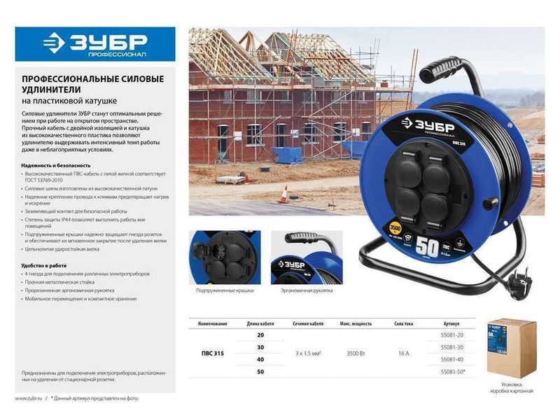 Удлинитель на катушке ПВС 315, 40 м, 3500 Вт, 4 гнезда, IP44, ПВС 3х1,5 кв мм, ЗУБР-684