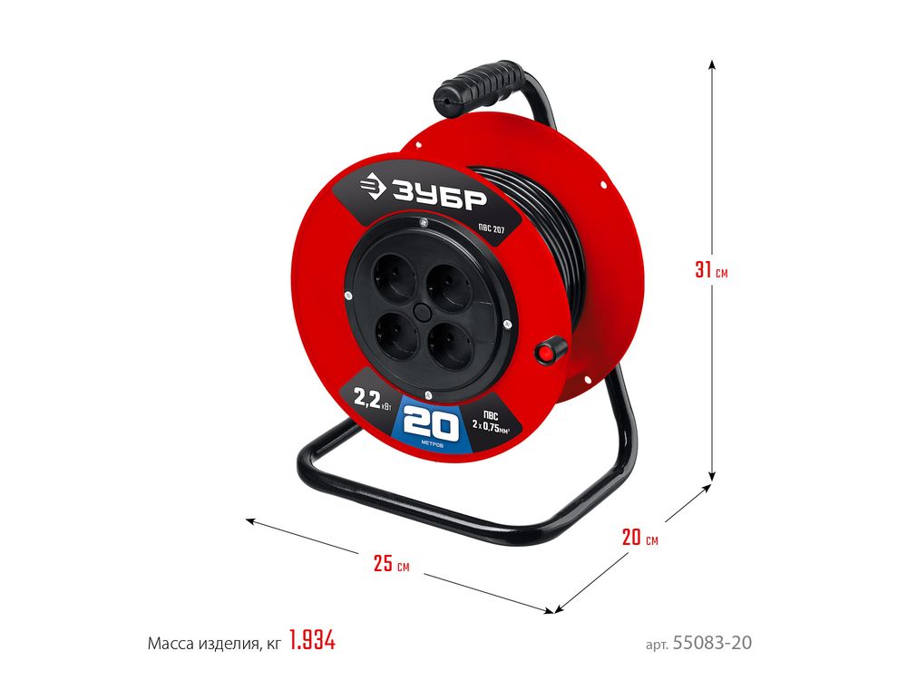 Удлинитель на катушке ПВС 307, 20 м, 2500 Вт, 4 гнезда, ПВС 3х0,75 кв мм, ЗУБР-684