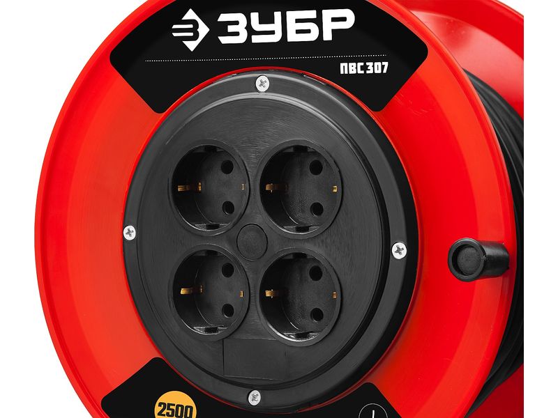 Удлинитель на катушке ПВС 307, 50 м, 2500 Вт, 4 гнезда, ПВС 3х0,75 кв мм, ЗУБР