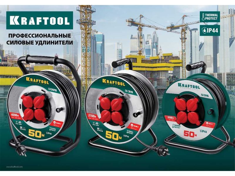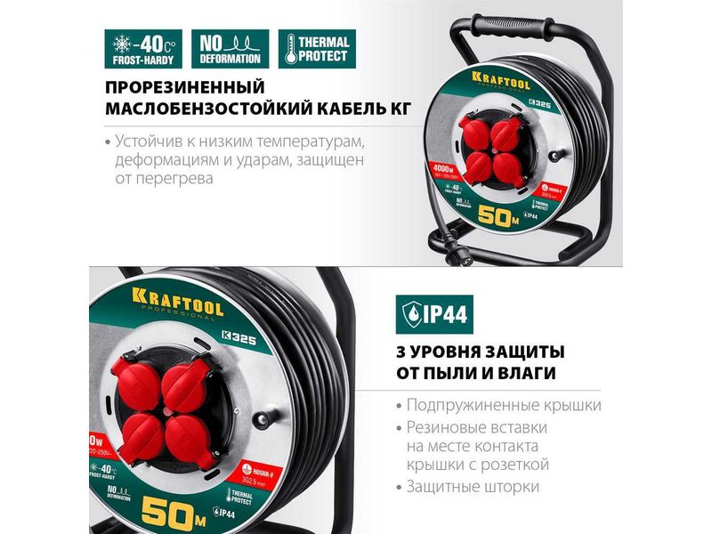 Купить K-325 удлинитель на катушке 50 м, 4000 Вт, 4 гнезда, IP44, КГ 3x2,5 кв мм, KRAFTOOL