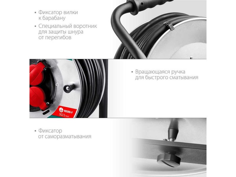 Катушка позволяет легко сматывать и разматывать кабель, обеспечивая мобильное перемещение и компактное хранение.
