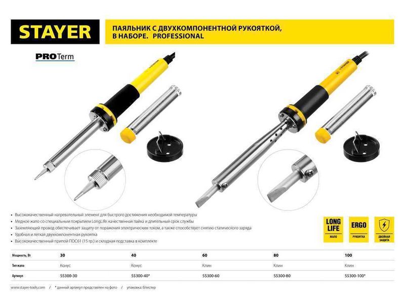 Паяльник STAYER "PROFI" с двухкомпонентной рукояткой и долговечным жалом, в комплекте (припой и подставка), 80 Вт, клин