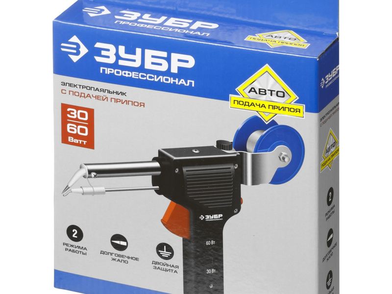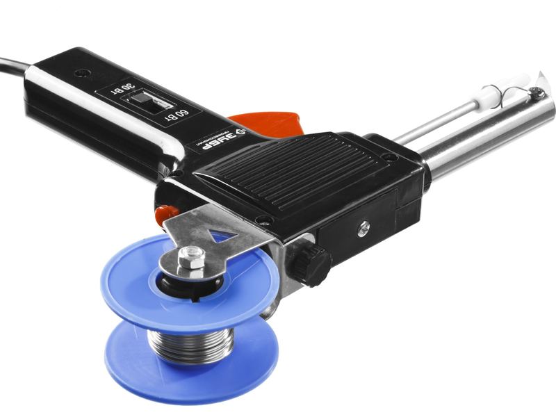 Паяльник ЗУБР "ПРОФЕССИОНАЛ" с подачей припоя, 2 мощности (30Вт/60Вт), диаметр проволоки припоя от 1 до 3мм