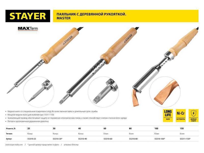 Паяльник с деревянной рукояткой и долговечным жалом, STAYER MASTER MAXTerm, 55310-60, 60 Вт, клин