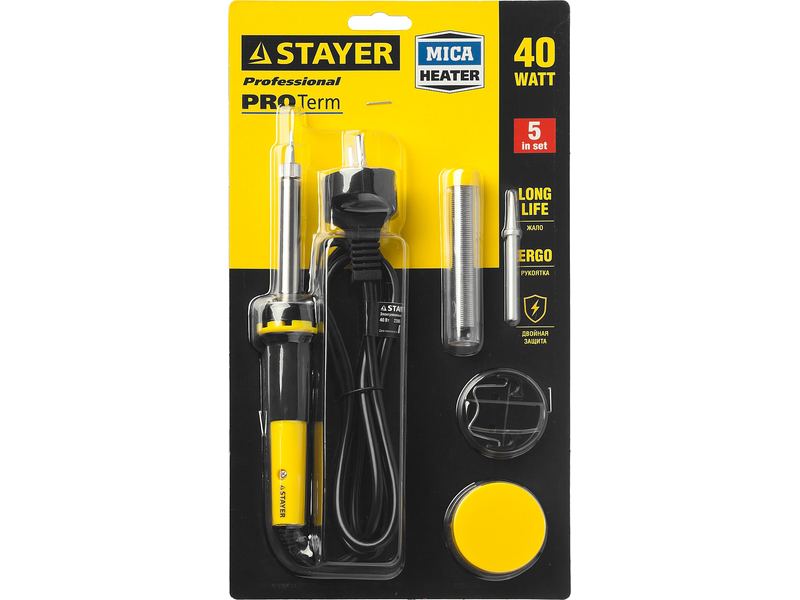 Набор для паяльных работ STAYER PROFI PROTerm, 55312-40-H5, паяльник 55300 + подставка + припой + жало сменное + канифоль, 40 Вт