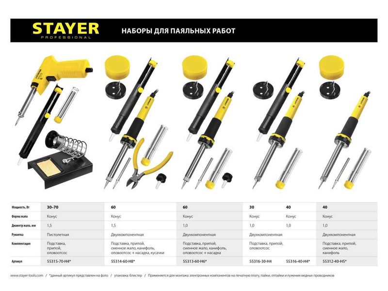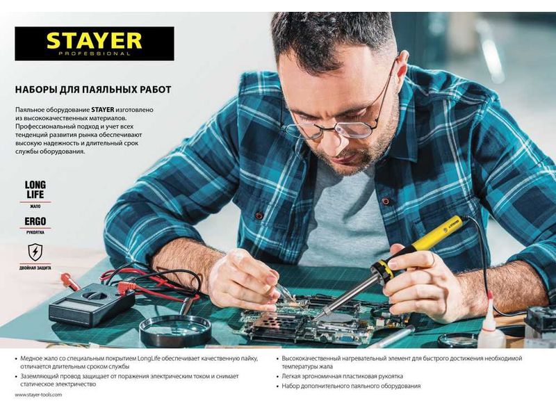 Паяльное оборудование STAYER создано на основе современных материалов и технологий. Благодаря соблюдению высоких стандартов качества, инструмент обеспечит надежную работу на протяжении всего срока службы. Является незаменимым помощником, обеспечивая удобство в работе и отличный результат.