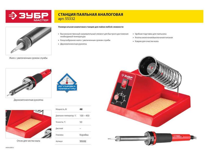 Паяльная станция ЗУБР МАСТЕР аналоговая, диапазон 100-450°C, с подставкой под паяльник, 2-х компонентная рукоятка, 48Вт