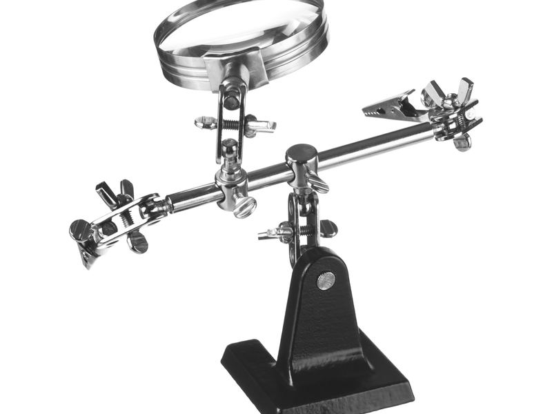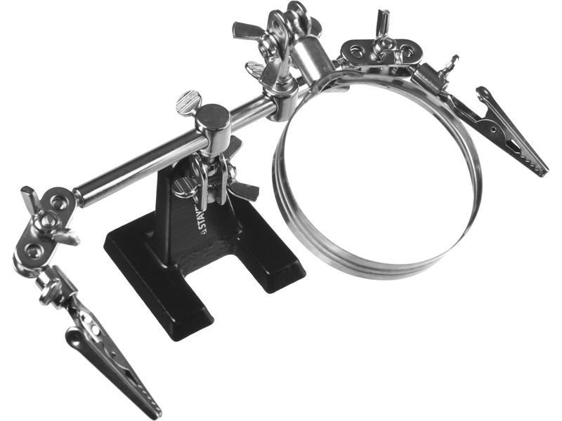 Штатив освобождает руки и позволяет легко осуществлять паяльные работы на электронной плате при помощи зажимов для крепления и поворотного механизма и качественной линзы. Необходимой при пайке элементов малого размера.