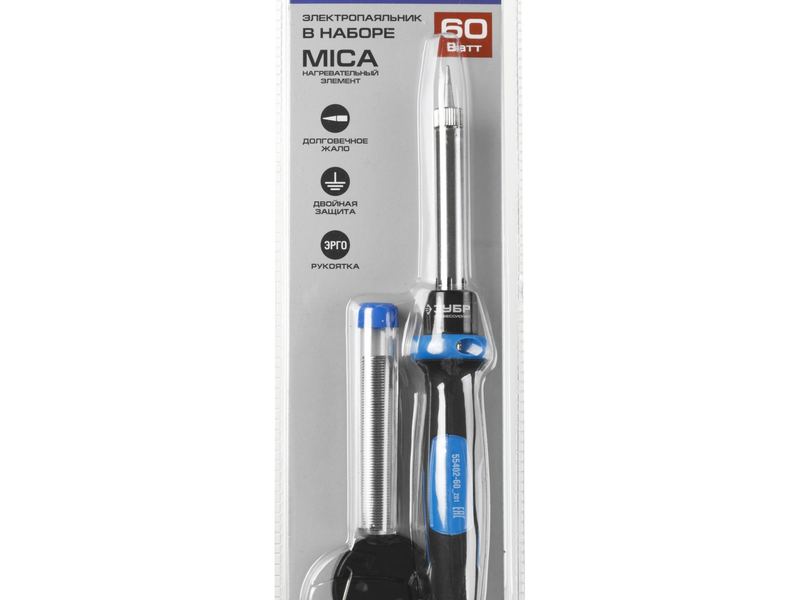 Купить Паяльник c двухкомпонентной рукояткой в наборе с припоем и подставкой, ЗУБР Профессионал 55402-60, 60Вт, конус