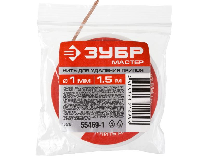 Нить ЗУБР "МАСТЕР" для удаления излишков припоя, 1мм, 1.5м