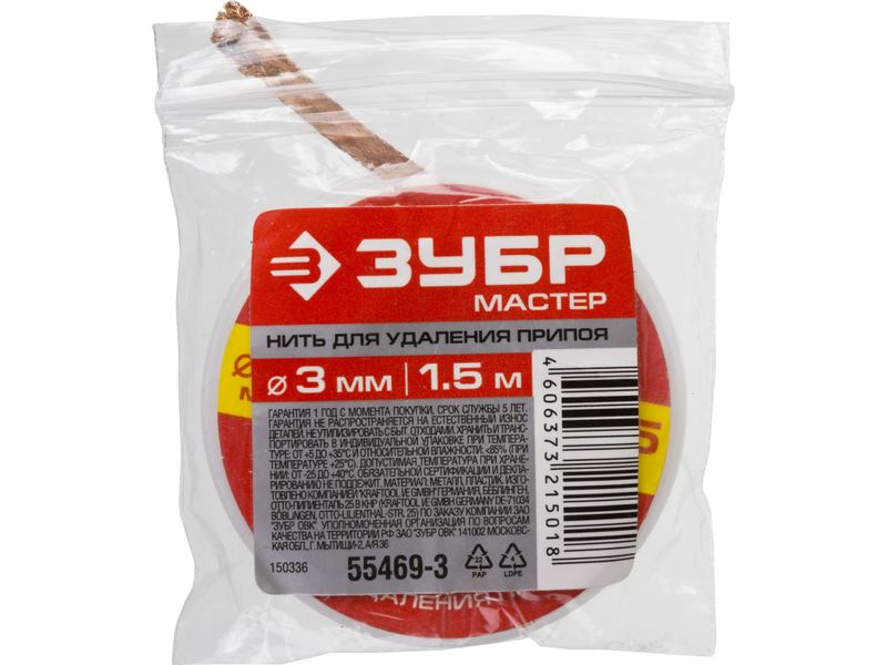 Нить ЗУБР "МАСТЕР" для удаления излишков припоя, 3мм, 1.5м