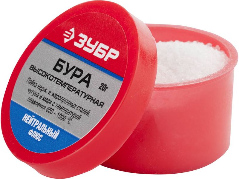 Флюс Бура Зубр 55476-020 применяется для пайки обычных металлов с благородными (золото, серебро, мельхиор). В расплавленном состоянии способен растворять оксиды металлов. Требует промывки горячей водой.